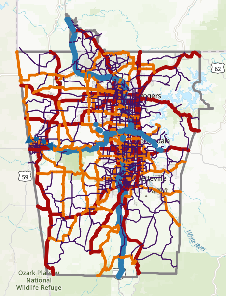 This interactive map displays the transportation network and projects in the 2025-2028 Transportation Improvements Program (TIP), the 2045 Metropolitan Transportation Plan, functionally classified roads, roads centerline file data and other transportation data and boundaries for the Northwest Arkansas Metropolitan Transportation Planning area.